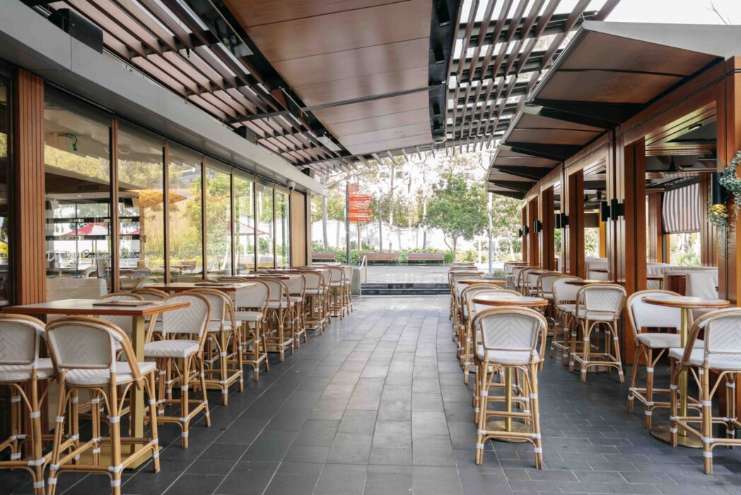 A mix of indoor and semi-covered outdoor space, comfortably hosting up to 75 seated or 180 guests for a cocktail-style event.
